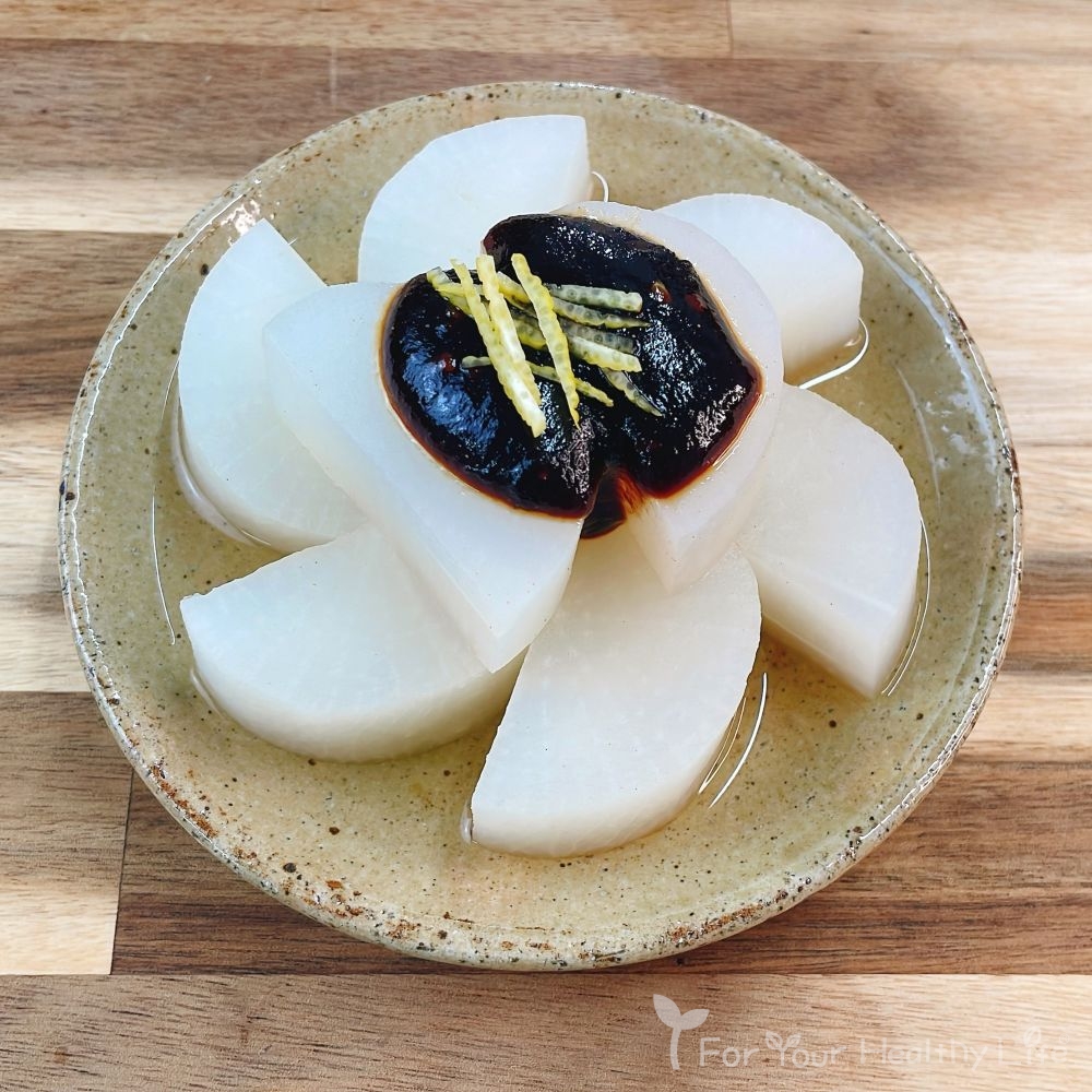 ① | 大根は皮をむき、半分に切り耐熱容器に入れる。Aを注ぎふわっとラップし、電子レンジ(600W)で10分加熱する。 |