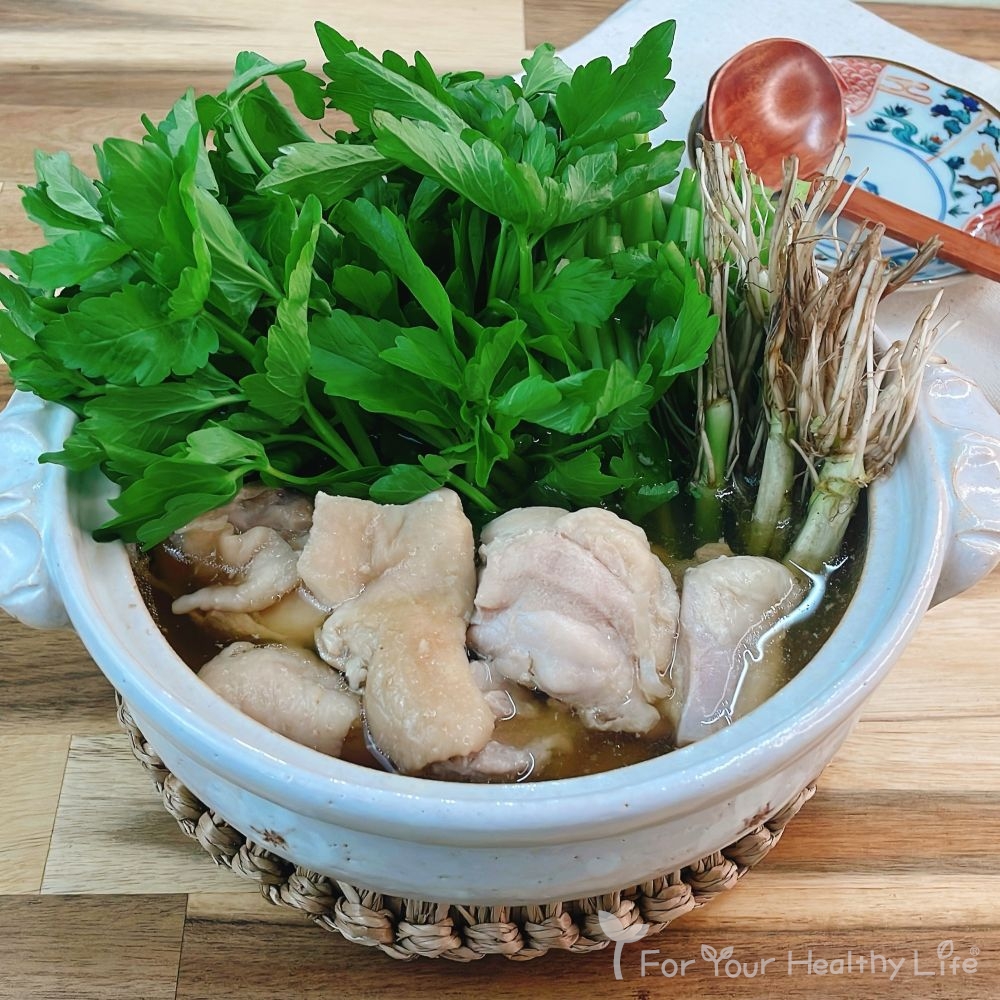 ② | 鍋に寄せ鍋つゆを注ぎ火にかける。沸騰したら鶏もも肉を入れ火を通す。食べる直前にせりを入れたら出来上がり。 |