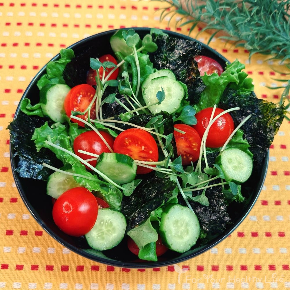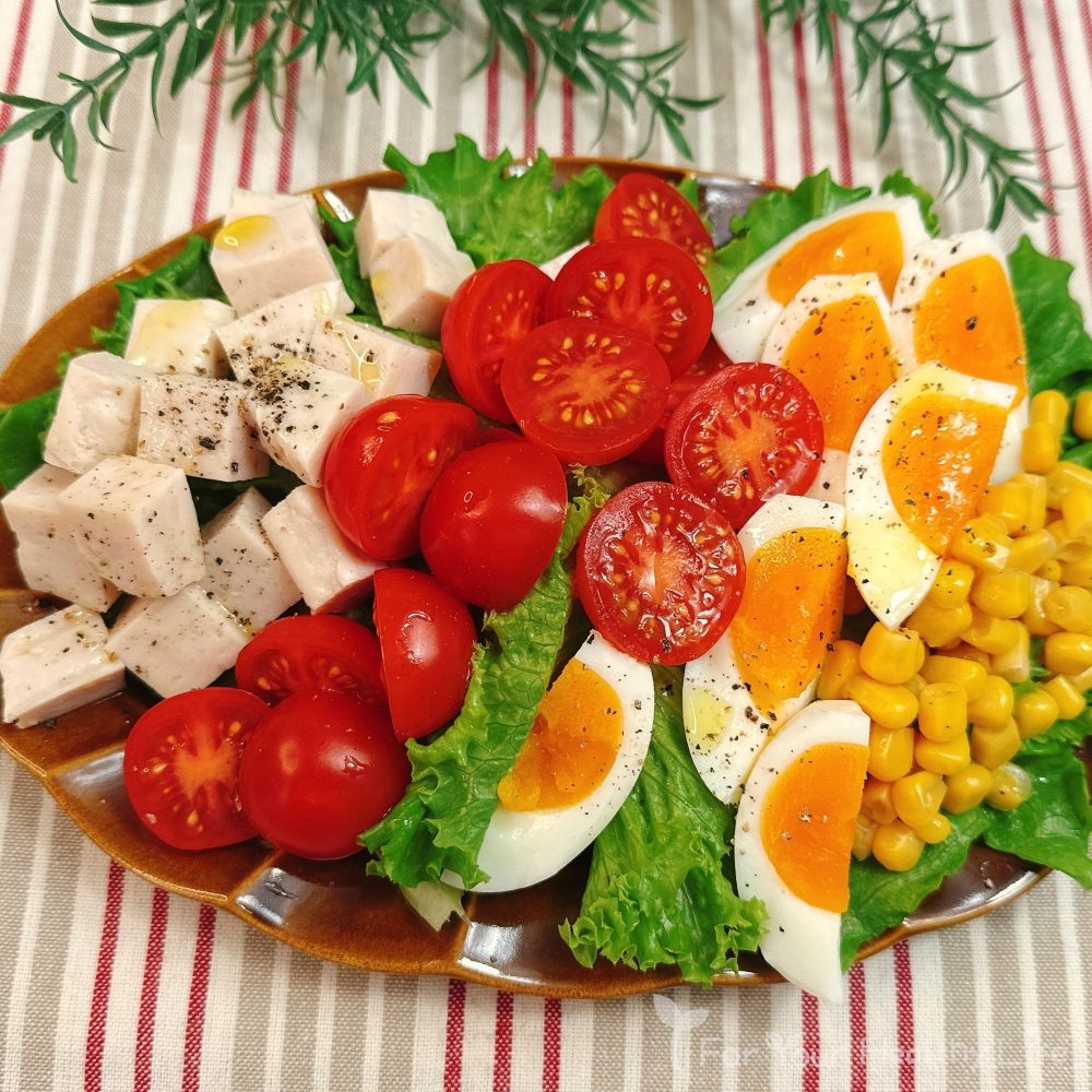 | ① | レタスはよく洗い一口大にちぎる。ミニトマトは半割にする。みょうがは千切りにする。サラダチキンは3cm程度にさく。 |