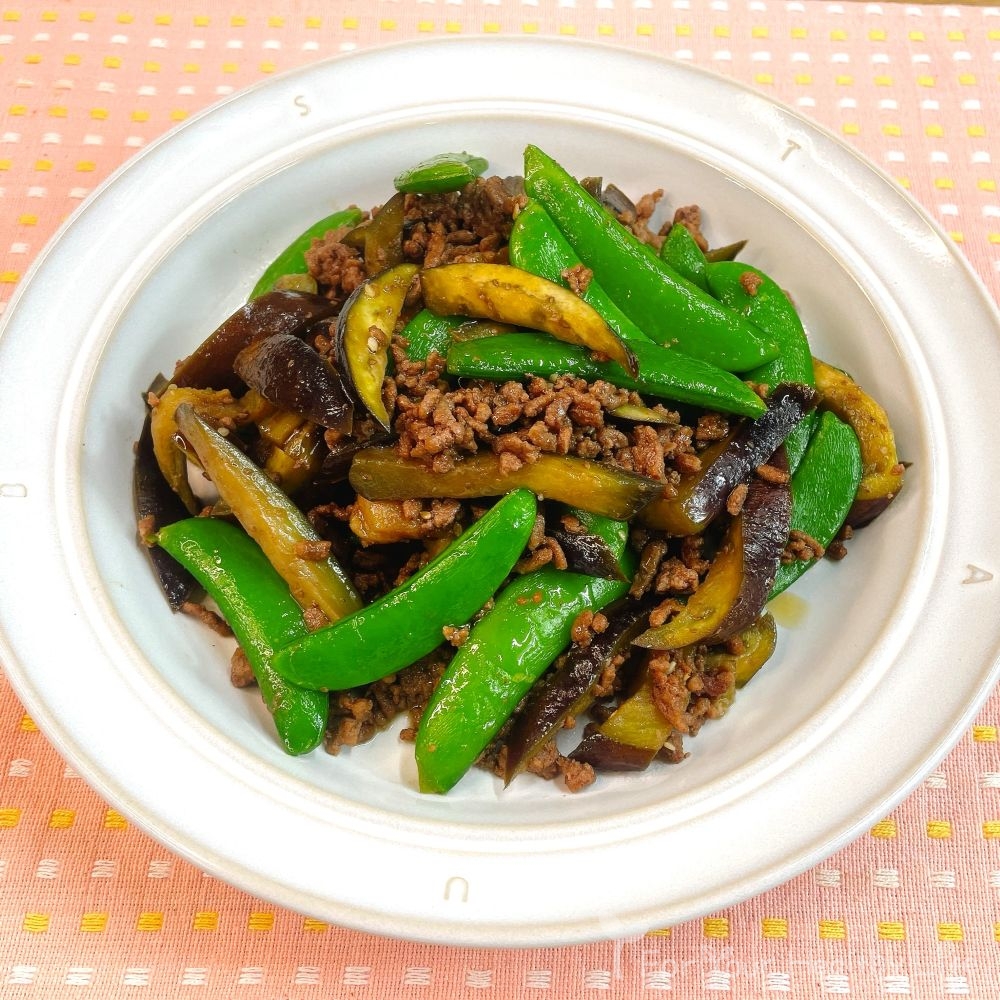 | ② | 冷たいフライパンに、九条ねぎとひき肉を入れて火にかける。半分くらい色が変われば、なすとにんにくの芽を入れフタをする。たまに混ぜながら5分蒸し焼きにする。 |