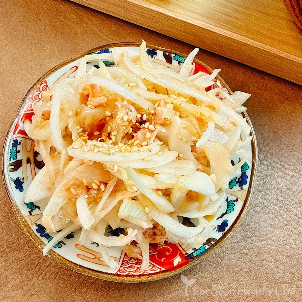 | ① | 新玉ねぎは薄いスライスにする。まな板の上に広げて5分置いておく。(空気に触れると辛み成分が少し和らぎます) |